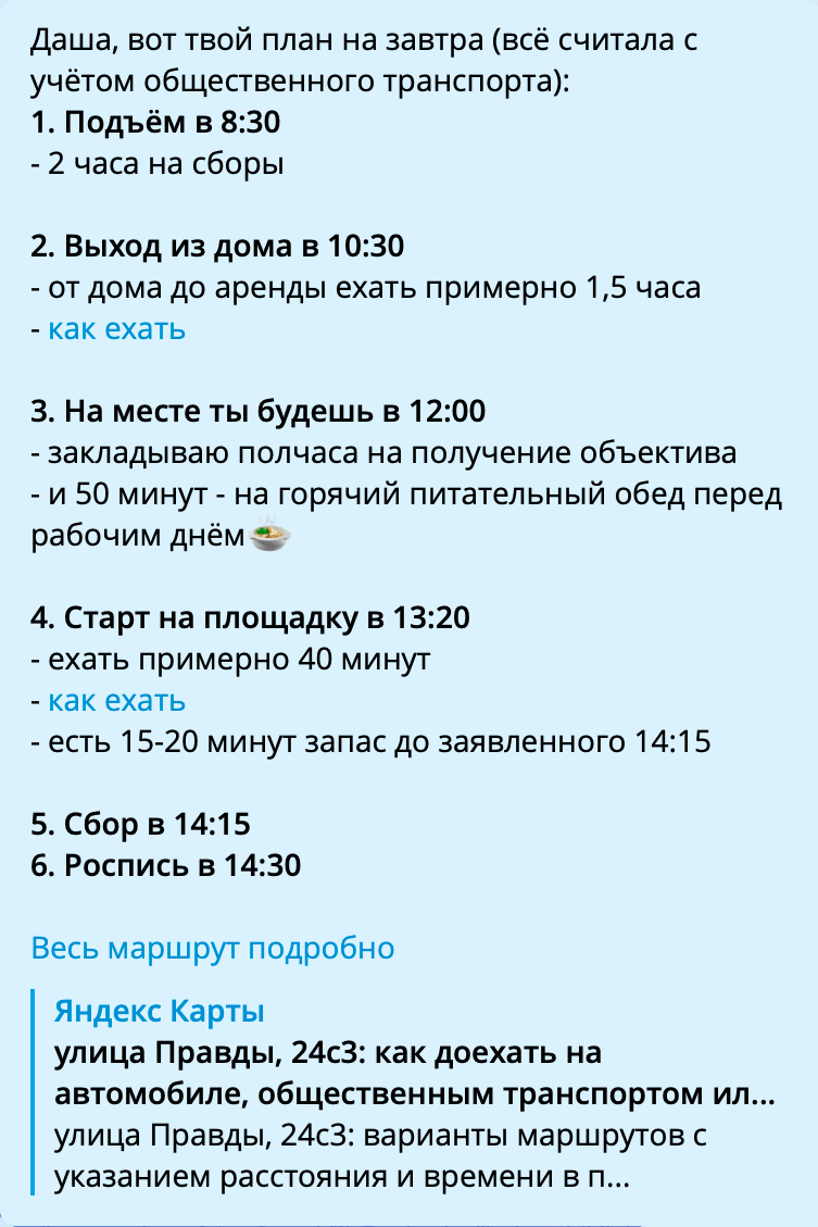 Мы сформируем для вас индивидуальный план на неделю и на каждый день, поможем собрать все детали съёмки в общую картину