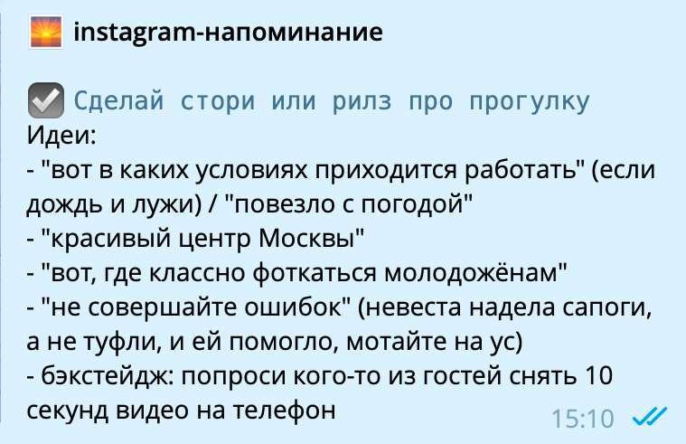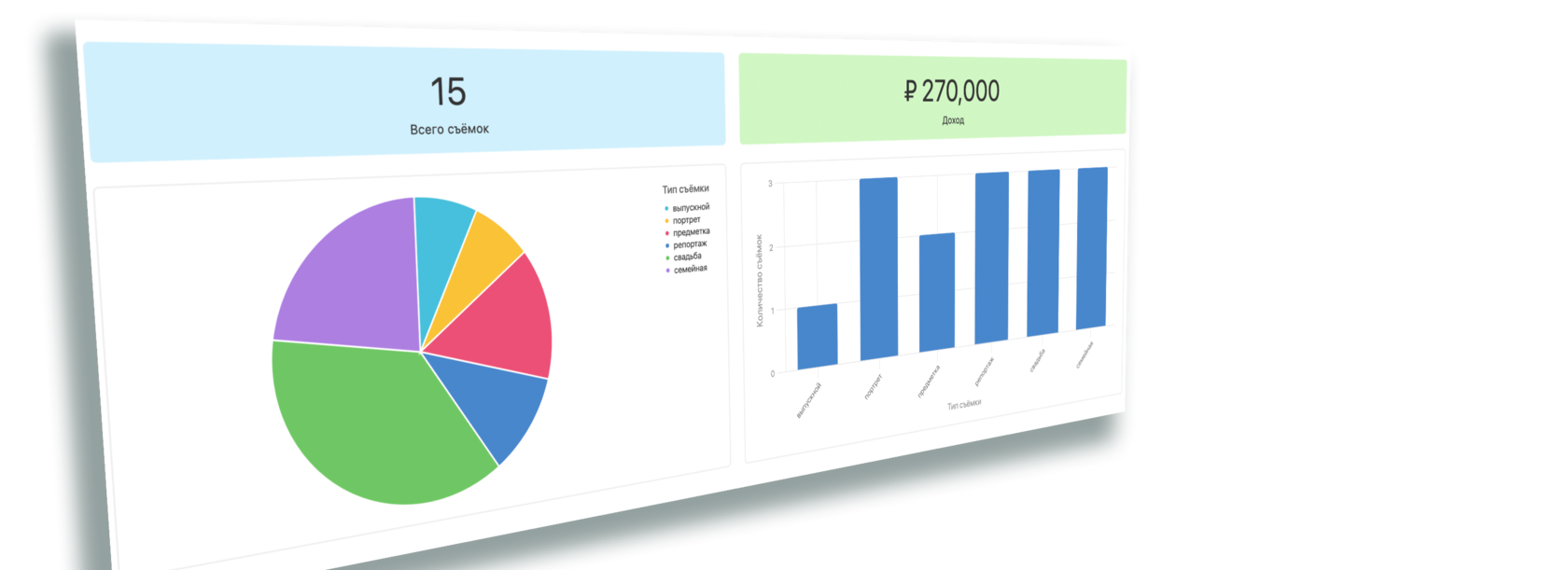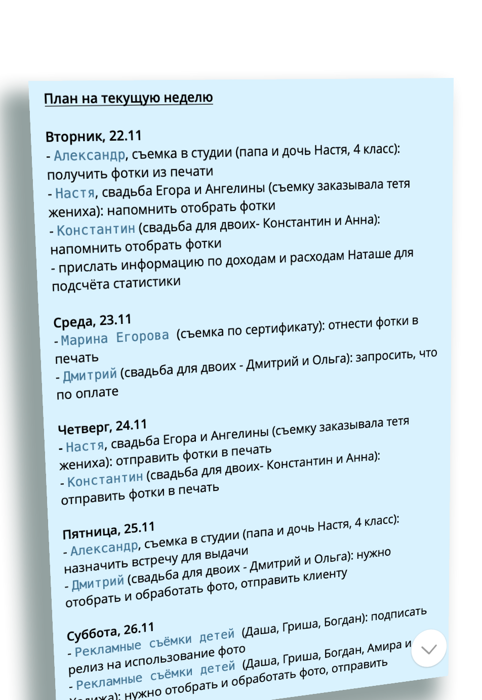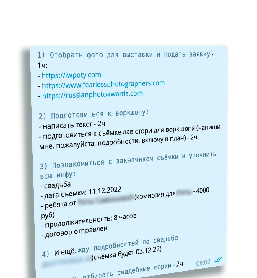 Всё, что нужно от вас - информация о съёмках и клиентах: в виде фото, текста, аудио или даже видео-сообщения. Ваш помощник заносит данные в подготовленную систему