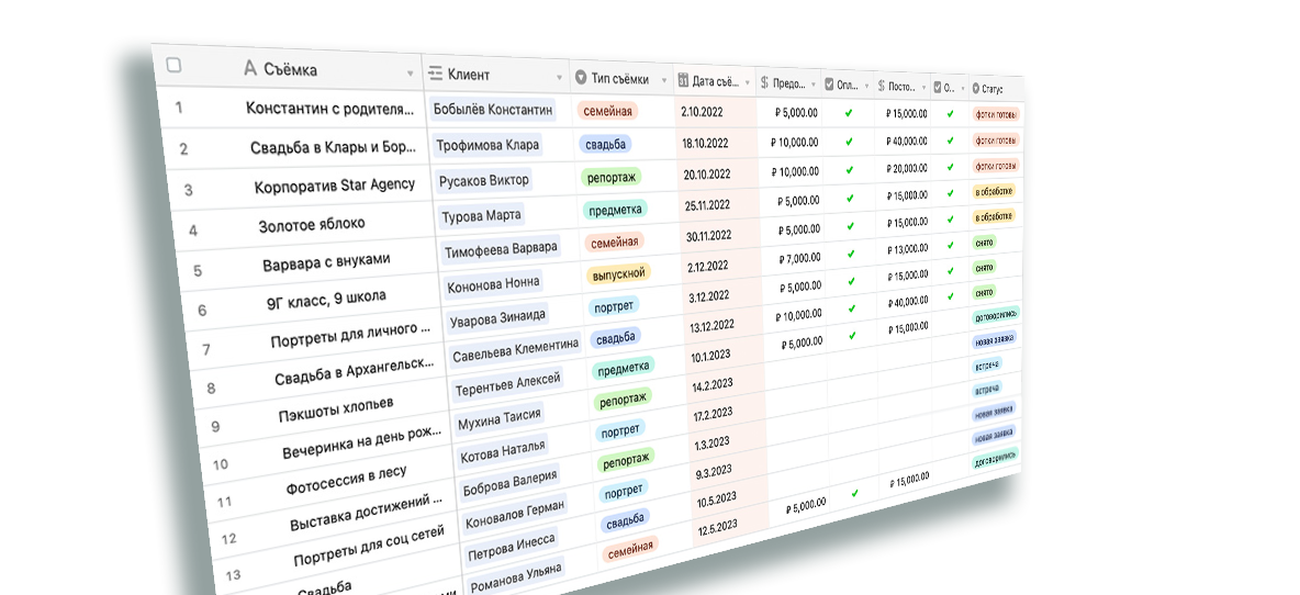 Таблица с данными о клиентах, встречах и съёмках - всегда в доступе